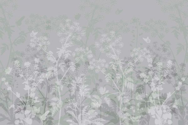 Een zachte compositie van silhouetten van bloemen en bladeren, verfijnd weergegeven in laagjes van transparante pastelkleuren. Vlinders en andere delicate details voegen een vleugje speelsheid toe aan de serene en organische sfeer.