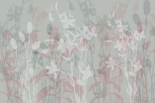 Een verfijnd spel van transparante bloemenschaduwen in delicate blauwtinten op een zachte, grijsgroene achtergrond. De sierlijke silhouetten van veldbloemen creëren een luchtige en rustgevende compositie die perfect harmonieert met natuurlijke omgevingen.