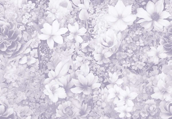 Een elegant bloemenpatroon met witte en lichtpaarse bloesems, vergezeld door zachtgroen blad. De pastelachtige paarsnuances in de achtergrond geven een kalme, stijlvolle ambiance. De verfijnde kleurverlopen in de bloemblaadjes accentueren de zachte, romantische uitstraling.