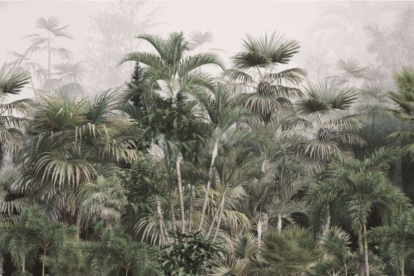 In dit woud waar de mist zacht tussen de fronds van de palmen hangt, krijgt de rijkdom van de natuur een bijna etherische kwaliteit. De diversiteit van het groen wordt samengebracht door de mist die rust en geheimzinnigheid uitstraalt.