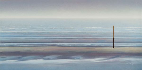 Dit kunstwerk straalt een kalme en minimalistische sfeer uit, met een zachte zee die zich tot aan de horizon uitstrekt. De delicate pasteltinten in blauw, grijs en zandkleur creëren een rustgevende uitstraling, terwijl de lichte golven subtiele beweging toevoegen aan de compositie. Centraal in het beeld staat een enkele houten paal, die als een markeerpunt fungeert en het geheel een gevoel van balans en eenvoud geeft.