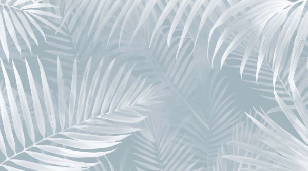 Een stijlvol en minimalistisch ontwerp met zachte palmbladeren in verfijnde grijstinten. De subtiele lagen en mistachtige schaduwen creëren een kalme, ingetogen sfeer die moeiteloos aansluit bij moderne en elegante interieurs.