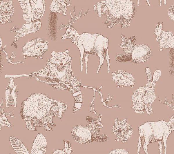 Dit ontwerp vangt de essentie van een levendig bos vol charmante dieren in een unieke, handgetekende stijl. Van nieuwsgierige wasberen en sierlijke herten tot schattige egels en sierlijke uilen, elk dier is met zorg en precisie geïllustreerd. Het patroon is opgebouwd in zachte sepia- en bruintinten, wat een warme en tijdloze uitstraling creëert. De subtiele lijnen en nostalgische tekenstijl geven een speels maar verfijnd karakter dat zowel kinderen als volwassenen aanspreekt.