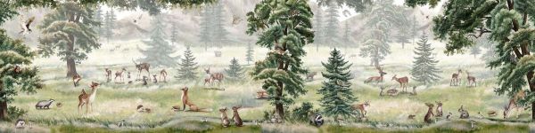 Een uitgestrekt berglandschap vol grazende herten, speelse konijnen, dassen, vossen, uilen en eekhoorns. Zachte groentinten en natuurnuances creëren een rustgevende, levensechte boswereld vol detail en diepte.