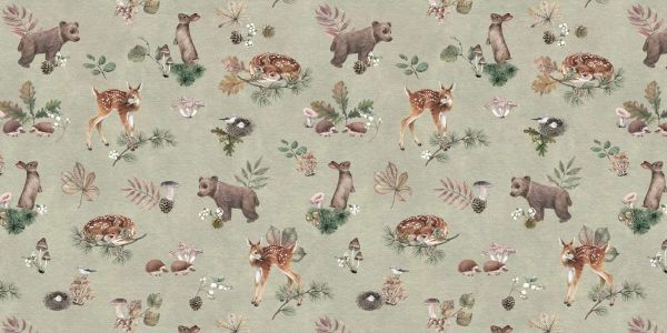 Een betoverend bospatroon met speelse dieren zoals herten, beren en konijnen, omringd door bladeren, paddenstoelen en andere bosdetails. Dit delicate ontwerp op een rustige achtergrond brengt de magie van het bos naar binnen, ideaal voor het creëren van een serene en natuurlijke sfeer in elke ruimte.