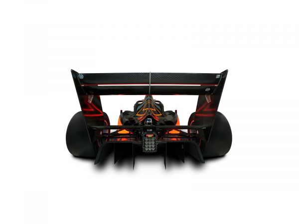 Achterzijde van een Formule 3 raceauto met hoogwaardige details van het regenlicht omringt door carbon.