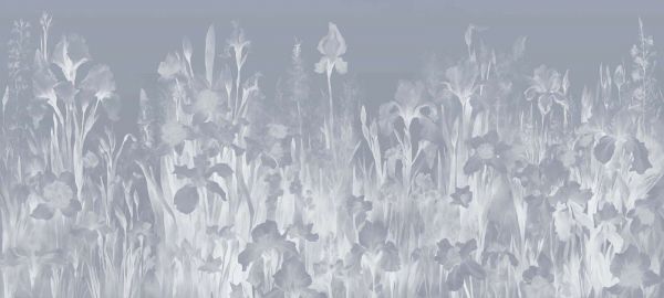 Irissen en narcissen stralen in een hemelsblauwe aquarelsetting, waardoor een heldere en opbeurende atmosfeer ontstaat. Ideaal om een interieur ruimtelijk en energiek te maken.