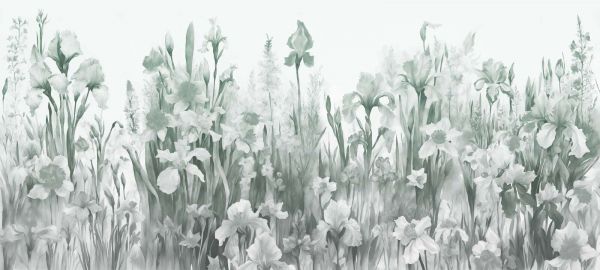 Een levendig tafereel vol irissen en narcissen, omlijst door diep tealblauwe aquareltonen. De combinatie van groen en blauw straalt frisheid en dynamiek uit, ideaal om een ruimte energie te geven.