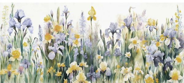 Een sprankelende bloemenzee met irissen en narcissen in warme, goudgele tinten. De heldere kleuraccenten en zachte aquarelstructuur geven een licht en vrolijk gevoel, perfect om elke ruimte te vullen met zonneschijn en optimisme.