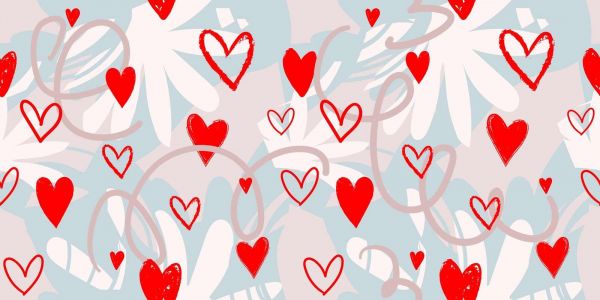 Dit ontwerp combineert romantiek en speelsheid met een frisse, moderne uitstraling. Op een zachte blauwgrijze achtergrond ontvouwen zich grote bloemachtige vormen in wit en lichtroze, die samen een luchtig canvas creëren. Daaroverheen dansen levendige rode en roze harten in diverse stijlen: handgetekend, omlijnd of speels ingekleurd. Zwierige krullen en lijnen lopen door het geheel, waardoor het patroon een gevoel van beweging en spontaniteit krijgt.
