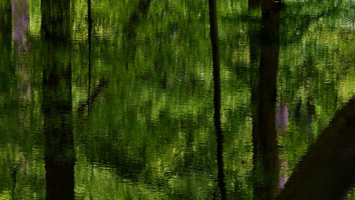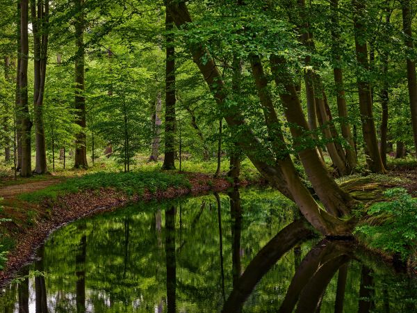 Gebogen bomen aan het water met een mooie weerspiegeling op een zonnige dag.