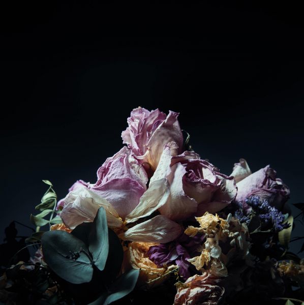 Een rustige afbeelding van gedroogde bloemen op een zwart achtergrond.