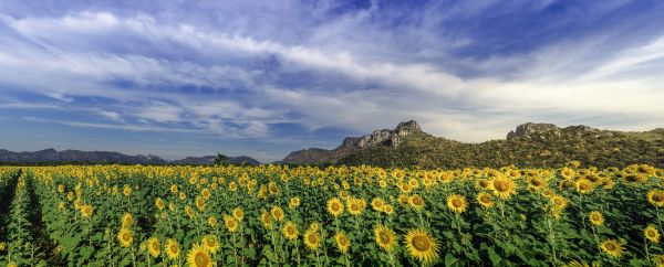Een panorama foto van een landschap gevuld met allemaal gele zonnebloemen met op de achtergrond bergen.