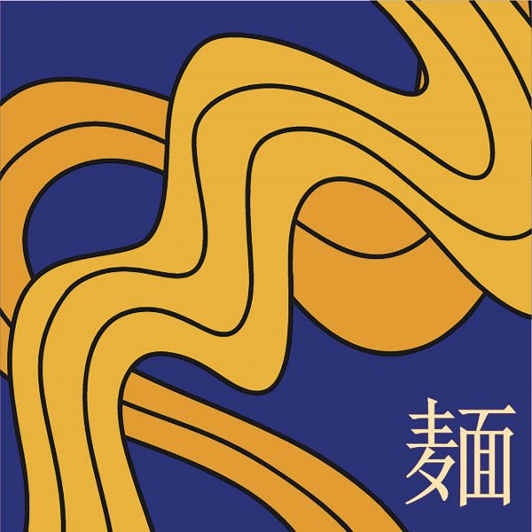 Een illustratie van close-up noedels op een blauw achtergrond.
