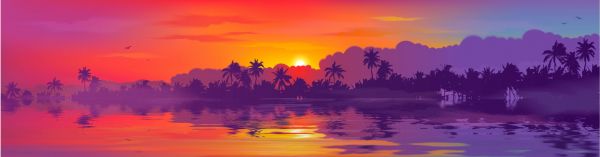 Geïllustreerde zonsondergang met de kleuren paars, rood, oranje, geel en blauw.