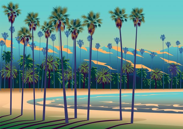 Fotobehang - Getekende meer met palmbomen