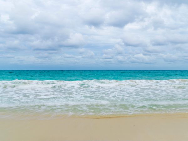Fotobehang met golvend water op een strand. Er is een ver uitzicht op het water. Dit uitzicht geeft het behang diepte.