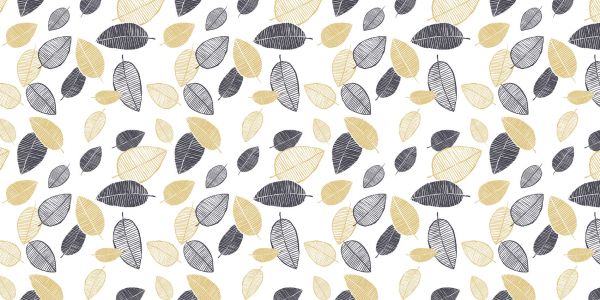 Goud behang met verschillende gouden en zwarte bladeren op een witte achtergrond.