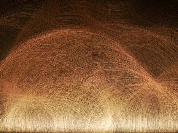 Een abstract, artistiek ontwerp van een goud en koperkleurig cirkelpatroon.