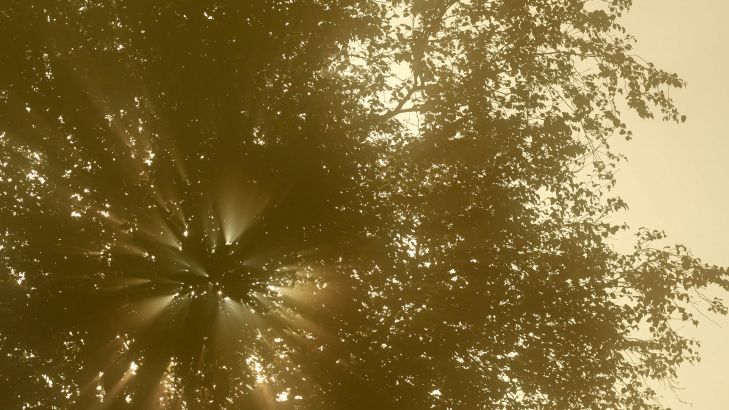Mooie goudkleurige zonsopkomst in natuurgebied. Door de bladeren van de boom is de zonsopkomst te zien.