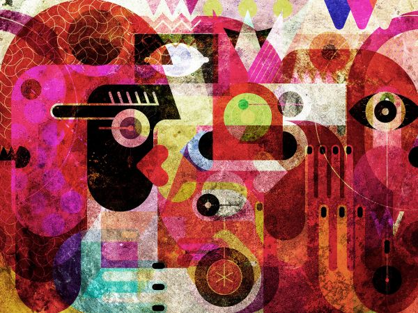 Kleurrijke graffiti met gezichten in een vintage look. Door de kleuren creëer je een vintage look in de kamer.