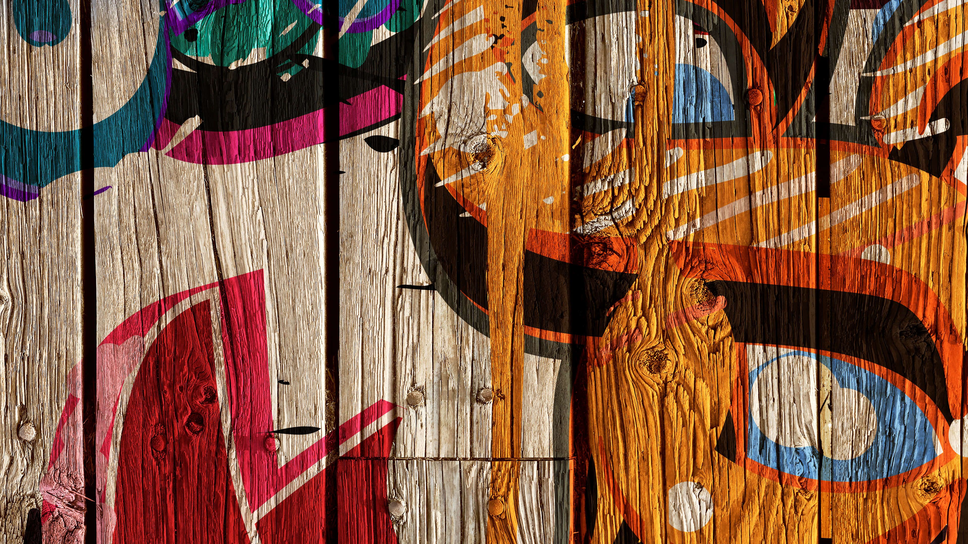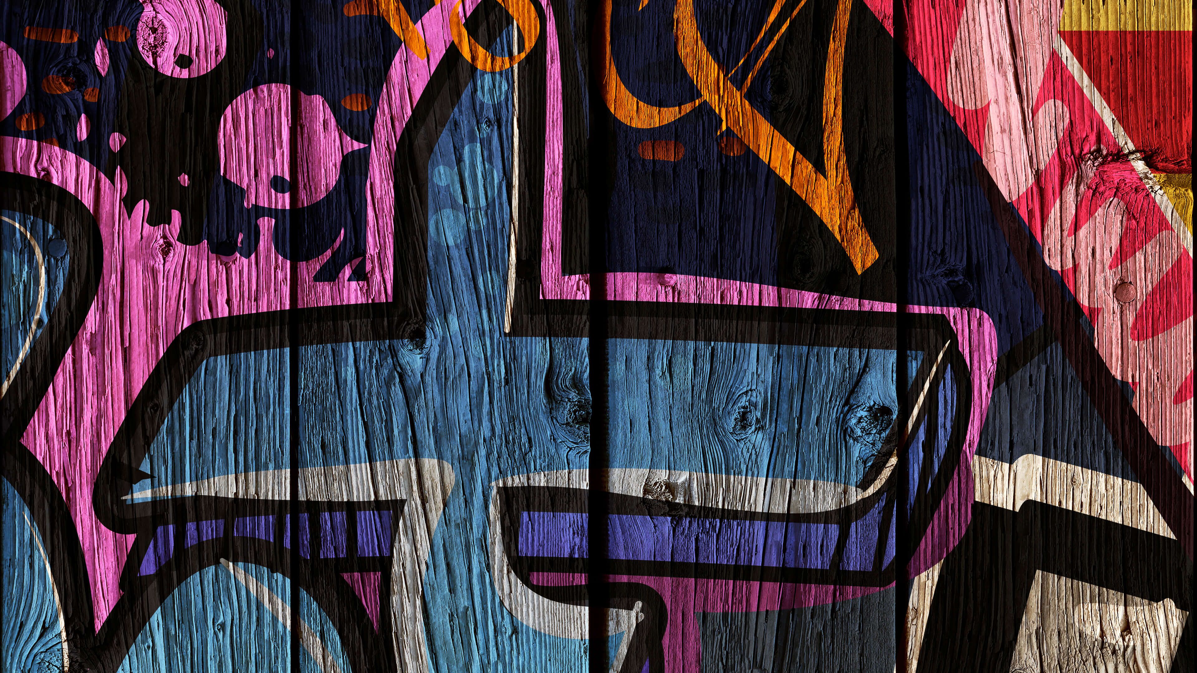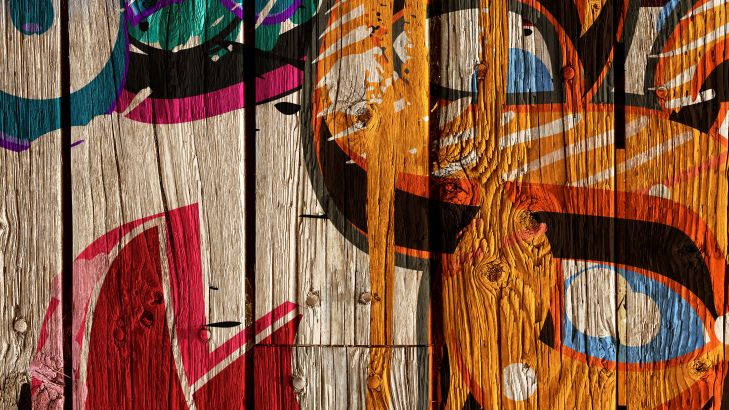 Stoere graffiti met letters op hout. Combineer dit fotobehang in jouw woning en creëer direct meer sfeer in huis.