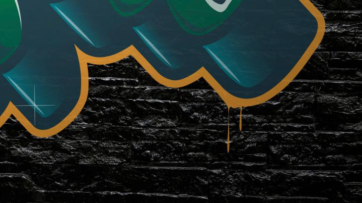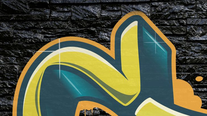 Graffiti op muur van zwarte stenen. Door de zwarte stenen komt de graffiti op dit behang mooi naar voren.