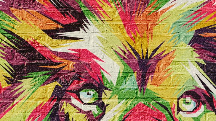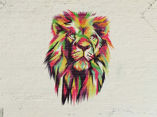 Graffiti van een leeuw op een witte bakstenen muur. Door de lichte achtergrond valt de graffiti leeuw extra goed op.