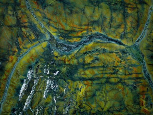 Groen marmer mer oranje vegen. Combiner dit fotobehang voor nog meer kleur in huis.
