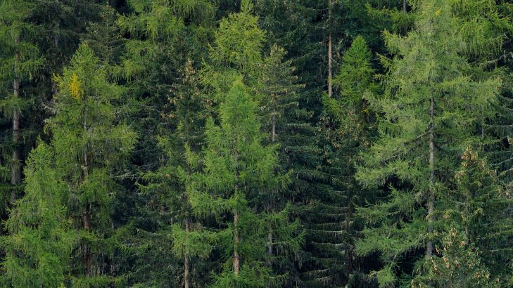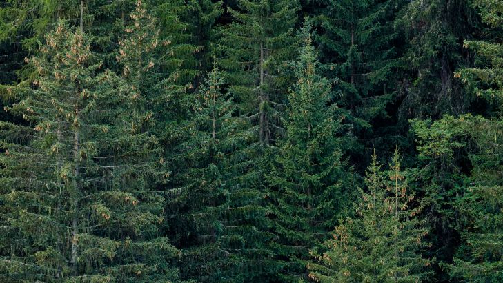 Groen sparrenbos op fotobehang. Met dit fotobehang haal je een stuk van het bos in huis.