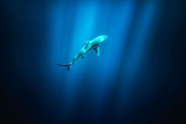 Een solitaire haai zweeft sierlijk door een diepe oceaan, badend in zachtblauwe lichtstralen die van boven door het water dringen. Het beeld is krachtig in zijn eenvoud en roept een mysterieuze, stille onderwatersfeer op.