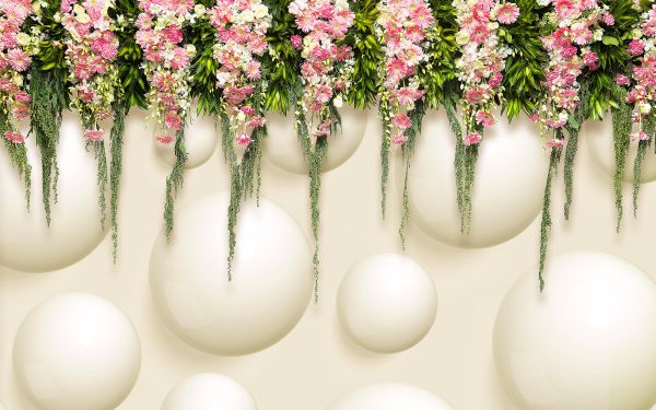 Hangende roze bloemen over 3D muur in verschillende materialen
