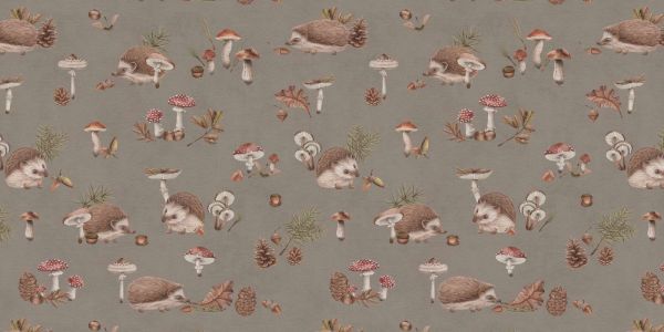 Een schattig patroon met egeltjes te midden van herfstige paddenstoelen, dennenappels en eikels. De zachte taupe achtergrond en gedetailleerde illustraties brengen een warme, bosachtige sfeer, ideaal voor het toevoegen van een knus en speels accent in elke ruimte.