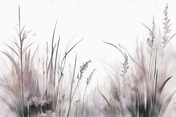 Een sfeervol ontwerp met zachte, nevelige grassen en verfijnde bloemen, uitgevoerd in grijsgroene en warme aardetinten. De subtiele penseelstreken en dromerige compositie creëren een serene, bijna poëtische sfeer. De lichte achtergrond versterkt het gevoel van ruimtelijkheid en brengt een vleugje rustgevende natuur naar binnen.
