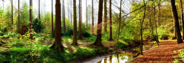 Panorama van een herfstbos met helder zonlicht dat door de bomen schijnt.