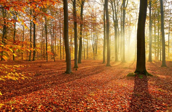 Een herfstbos in de ochtend met zonnestralen die door de bomen schijnen.