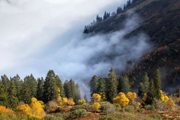 Gouden herfstkleuren lichten op tussen donkergroene naaldbomen, terwijl nevelslierten langzaam door het bergbos trekken. Een spel van kleur en stilte dat een mystieke en kalme sfeer oproept.