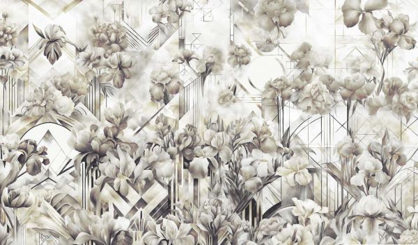 Een tijdloos ontwerp waarin elegante irissen en pioenen samensmelten met verfijnde Art Deco-geometrie. De subtiele goud- en crèmetinten geven het een nostalgische, luxe uitstraling. De zachte aquareltechniek en delicate structuren creëren een harmonieus en stijlvol geheel met een vleugje vintage charme.