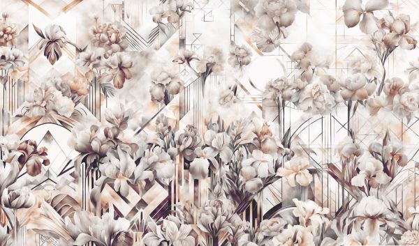 Dit prachtige ontwerp combineert de weelderige elegantie van bloemen met de symmetrische precisie van de Art Deco-stijl. De gedetailleerde irissen en pioenen bloeien tegen een achtergrond van verfijnde geometrische patronen, wat zorgt voor een unieke mix van romantiek en architecturale klasse. De warme sepia-, crème- en goudtinten brengen een gevoel van vintage luxe en tijdloze verfijning.