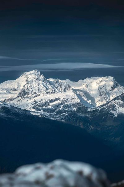In dit beeld komt een indrukwekkende winterse bergketen tot leven, waarbij de met sneeuw bedekte toppen helder afsteken tegen een donkere, blauwgrijze lucht. De dramatische belichting benadrukt de scherpe vormen van het gebergte, met diepe schaduwen en glanzend witte vlakken die elkaar afwisselen. De wolken zijn subtiel en dun uitgesmeerd als strepen aan de hemel, waardoor het beeld een mysterieus en sereen karakter krijgt.