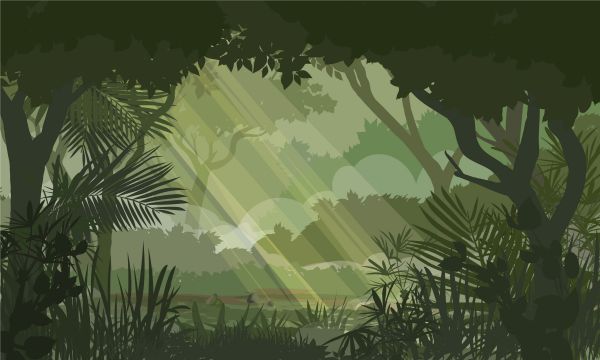Illustratie met een groene jungle in verschillende tinten.