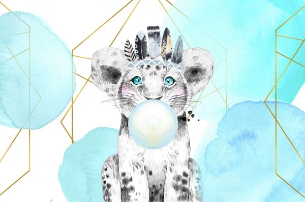 Prachtig behang met een babyleeuw die een grote kauwgombel blaast.