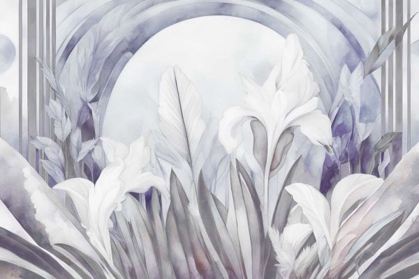 Een etherisch ontwerp met sierlijke witte irissen en zachte bladmotieven, uitgevoerd in een aquarelstijl. De koele blauwtinten, grijze nuances en subtiele paarse accenten creëren een dromerige, mistige sfeer. Architectonische lijnen en bogen voegen een vleugje Art Deco toe, waardoor het geheel een tijdloze en elegante uitstraling krijgt.