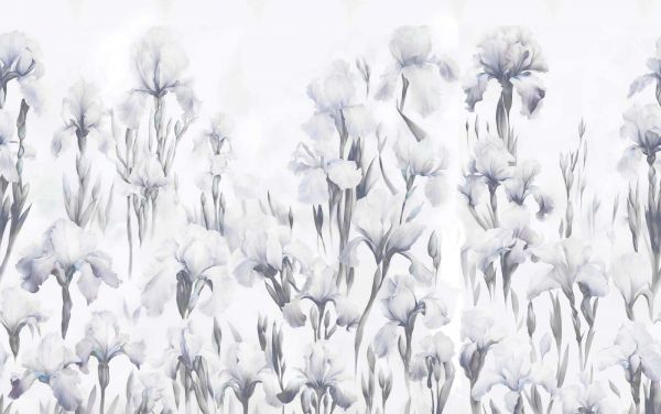 Elegante irissen in verfijnde grijstonen zorgen voor een tijdloze en subtiele uitstraling. De zachte aquareltechniek en delicate penseelstreken brengen een moderne en serene sfeer in de ruimte.