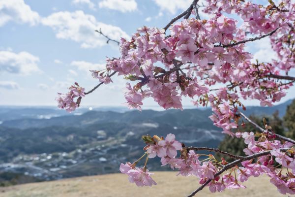 Een gedetailleerde afbeelding van roze Japanse bloesems met bergen op de achtergrond.