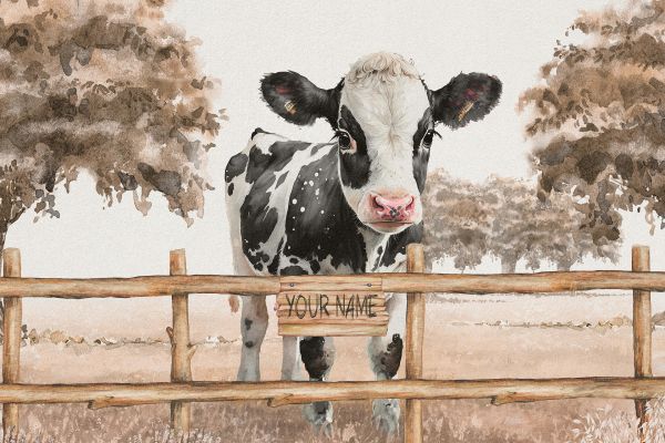 Een schattige, zwart-witte koe kijkt nieuwsgierig over een houten hek, haar blik vol onschuld en interesse. Het landschap erachter, bestaande uit schilderachtige bomen en een zachte weide in taupe, geeft het beeld een gevoel van rust en ruimte.