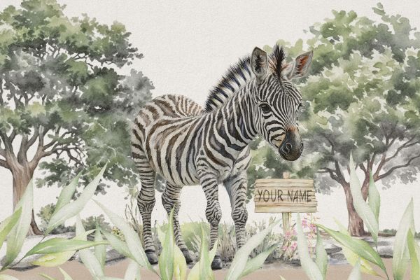 Een jonge zebra midden in de natuur. Dit behang is nu ook verkrijgbaar met de naam van uw kind!