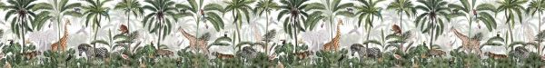 Een tropisch regenwoud vol wilde dieren zoals giraffen, zebra’s, tijgers, olifanten en kleurrijke vogels. Rijke beplanting en weelderige palmbomen brengen de jungle tot leven.
