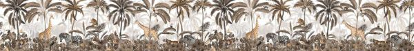 Een elegante junglescène in neutrale tinten met giraffen, zebra’s, tijgers, olifanten en exotische vogels tussen sierlijke palmbomen. Stijlvol en rijk aan detail, maar met een rustige uitstraling.