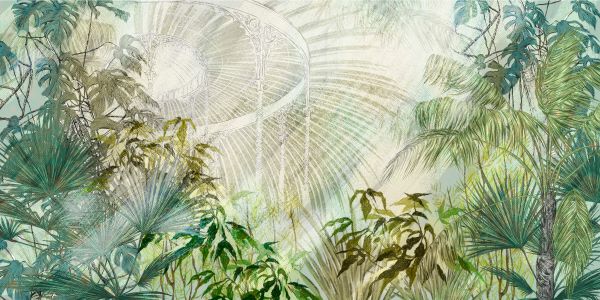Fotobehang van een tekening van een kas met tropische planten. Combineer dit in de kamer voor meer sfeer.